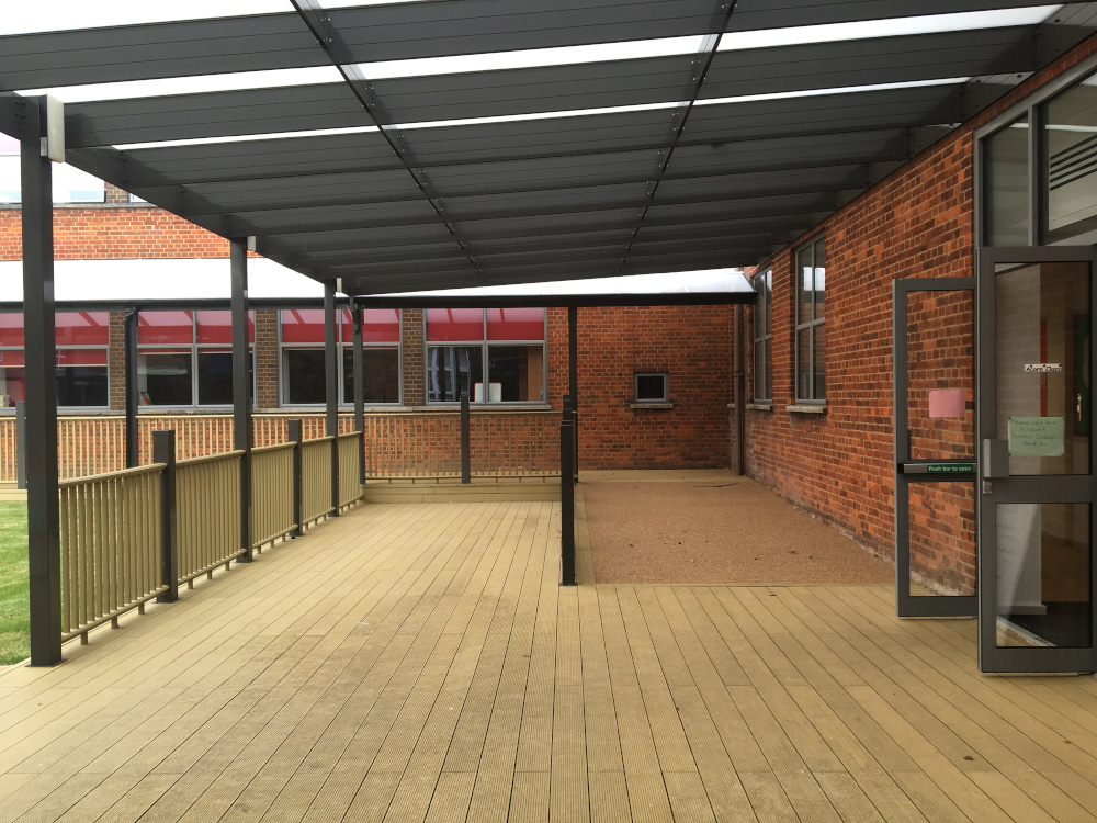 Create a vibrant covered outdoor play & learning area which protects pupils from all weather conditions. Choose from any colour to match or elevate your existing building.